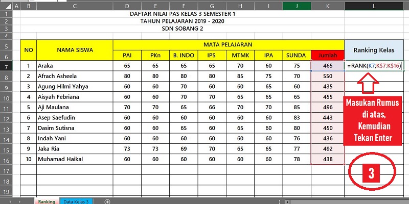 rumus =RANK(K7;K$7:K$16) kemudian